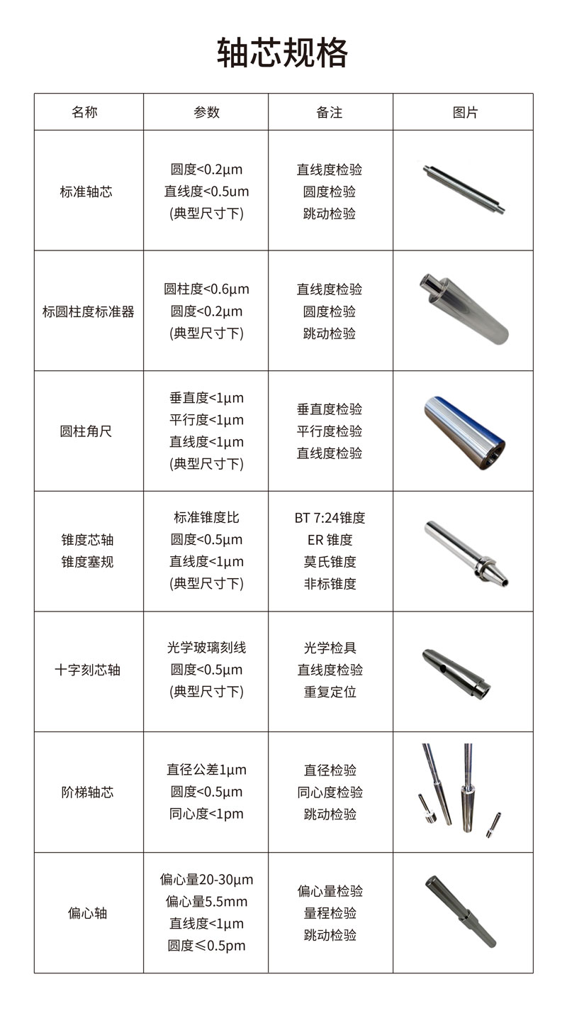 標準芯軸、偏心軸、階梯芯軸、錐度芯軸、錐度塞規(guī)、十字刻線芯軸、圓柱角尺、圓柱度標準器