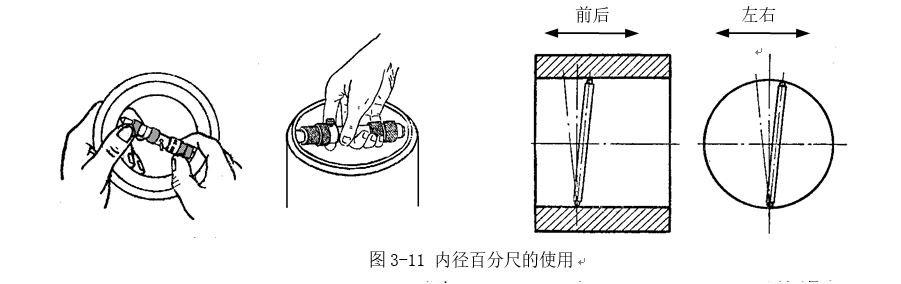 內徑百分尺上,沒有測力裝置,測量壓力的大小完全靠手中的感覺。測量時,是把它調整到所測量的尺寸后(圖3-11),輕輕放入孔內試測其接觸的松緊程度是否合適。一端不動,另一端作左、右、前、后擺動。左右擺動,必須細心地放在被測孔的直徑方向,以點接觸,即測量孔徑的最大尺寸處(最大讀數(shù)處),要防止如圖3-12所示的錯誤位置。前后擺動應在測量孔徑的最小尺寸處(即最小讀數(shù)處)。按照這兩個要求與孔壁輕輕接觸,才能讀出直徑的正確數(shù)值。測量時,用力把內徑百分尺壓過孔徑是錯誤的。這樣做不但使測量面過早磨損,且由于細長的測量桿彎曲變形后,既損傷量具精度,又使測量結果不準確。