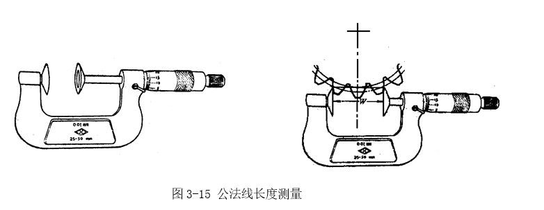 公法線長(zhǎng)度千分尺如圖3-15所示。主要用于測(cè)量外嚙合圓柱齒輪的兩個(gè)不同齒面公法線長(zhǎng)度,也可以在檢驗(yàn)切齒機(jī)床精度時(shí),按被切齒輪的公法線檢查其原始外形尺寸。它的結(jié)構(gòu)與外徑百分尺相同,所不同的是在測(cè)量面上裝有兩個(gè)帶精確平面的量鉗(測(cè)量面)來(lái)代替原來(lái)的測(cè)砧面。