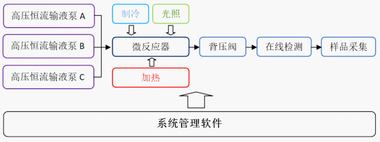 如圖所示,物料通過(guò)高壓輸液泵輸送到微反應(yīng)器中,在高壓密閉的微通道管路中,通過(guò)溫度控制,,使合成反應(yīng)能夠快速完成并極大提高收率,背壓閥能夠人為控制反應(yīng)器內(nèi)壓力,物料在出口處通過(guò)在線檢測(cè)器檢測(cè)合成結(jié)果,經(jīng)過(guò)檢測(cè)后的產(chǎn)品可通過(guò)樣品采集器按預(yù)設(shè)的收集條件收集到不同的容器中。整個(gè)反應(yīng)系統(tǒng)可通過(guò)管理軟件實(shí)現(xiàn)自動(dòng)控制,具有方法建立、模塊搭建、模塊參數(shù)設(shè)置,全反應(yīng)過(guò)程參數(shù)實(shí)時(shí)監(jiān)控,數(shù)據(jù)追溯,用戶管理及智能專家數(shù)據(jù)庫(kù)等功能,專用管理軟件可將整個(gè)反應(yīng)體系效率發(fā)揮到極致。