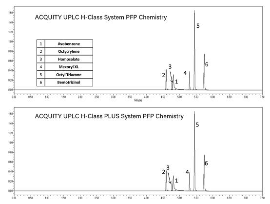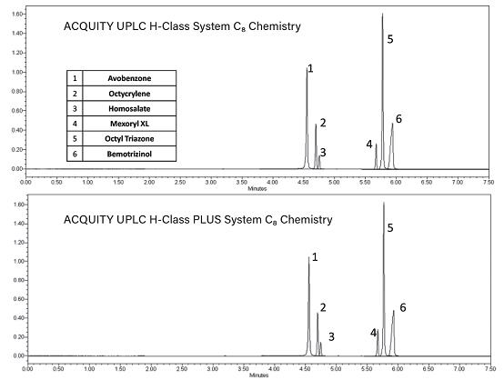 圖2.分別在ACQUITY UPLC H-Class和ACQUITY UPLC H-Class PLUS系統上使用ACQUITY UPLC HSS PFP色譜柱分離各種防曬霜活性成分標準品得到的疊加色譜圖。