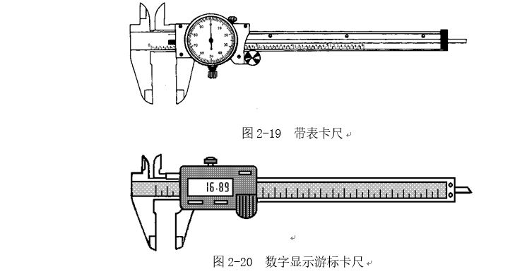以上所介紹的各種游標卡尺都存在一個共同的問題,就是讀數不很清晰,容易讀錯,有時不得不借放大鏡將讀數部分放大。現有游標卡尺采用無視差結構,使游標刻線與主尺刻線處在同一平面上,消除了在讀數時因視線傾斜而產生的視差;有的卡尺裝有測微表成為帶表卡尺(圖2-19),便于讀數準確,提高了測量精度;更有一種帶有數字顯示裝置的游標卡尺(圖2-20),這種游標卡尺在零件表面上量得尺寸時,就直接用數字顯示出來,其使用極為方便。