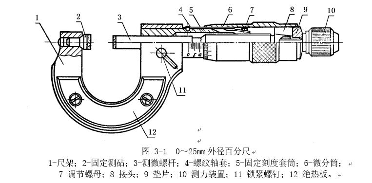 各種百分尺的結(jié)構(gòu)大同小異,常用外徑百分尺是用以測(cè)量或檢驗(yàn)零件的外徑、凸肩厚度以及板厚或壁厚等 (測(cè)量孔壁厚度的百分尺,其量面呈球弧形 )。百分尺由尺架、測(cè)微頭、測(cè)力裝置和制動(dòng)器等組成。圖3―1是測(cè)量范圍為 0~25mm的外徑百分尺。 尺架1的一端裝著固定測(cè)砧2,另一端裝著測(cè)微頭。固定測(cè)砧和測(cè)微螺桿的測(cè)量面上都鑲有硬質(zhì)合金,以提高測(cè)量面的使用壽命。尺架的兩側(cè)面覆蓋著絕熱板12, 使用百分尺時(shí),手拿在絕熱板上,防止人體的熱量影響百分尺的測(cè)量精度。